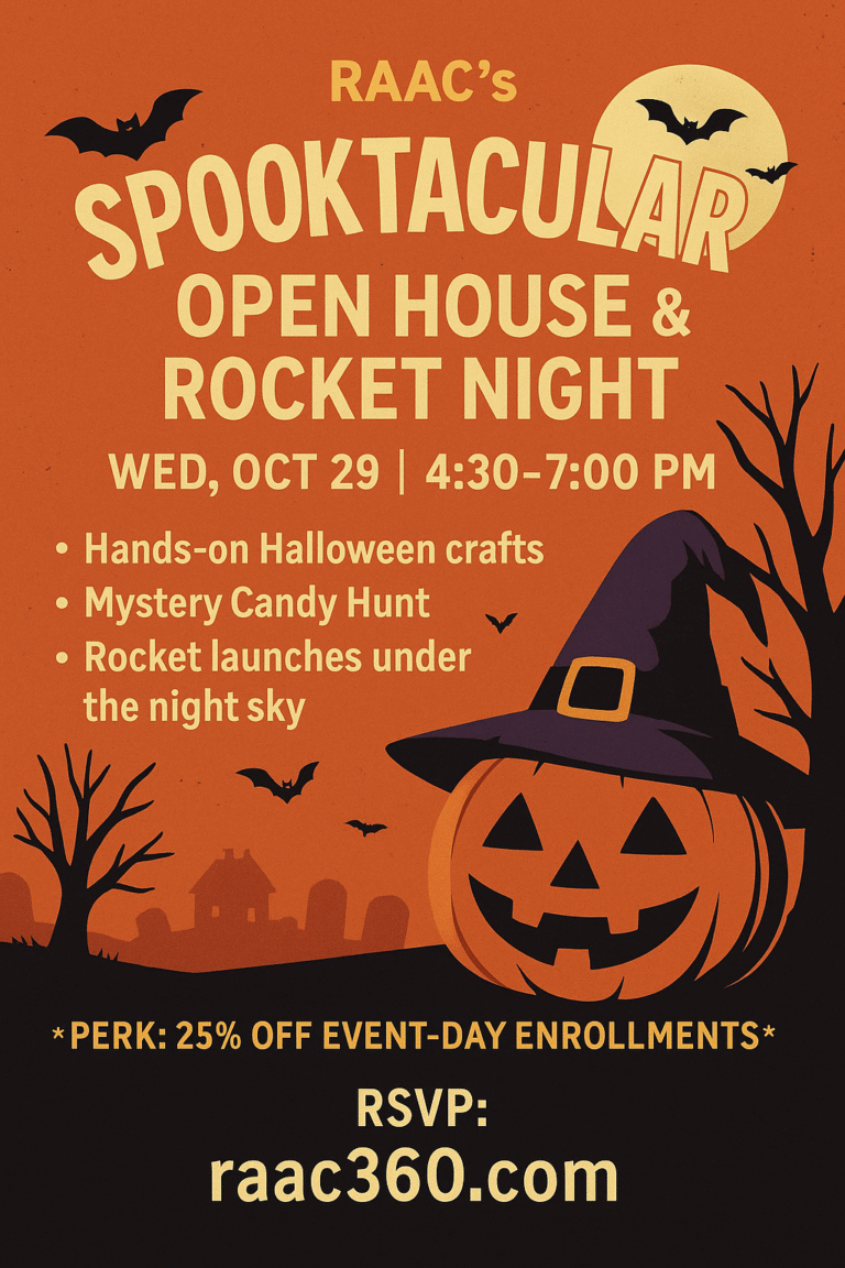 Bring your kiddos in costume for hands-on Halloween Crafts, a Mystery Candy Hunt, and Rocket Launches—while parents tour RAAC’s cozy new space, meet teachers, and preview our premium K–12 Spring classes.