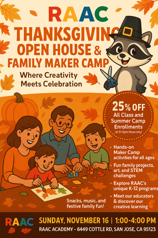 Families across the Bay Area are invited to RAAC Academy’s Thanksgiving Open House β€” a one-of-a-kind Maker Camp experience where kids and parents can explore hands-on projects, meet our amazing educators, and see what makes RAAC so unique!